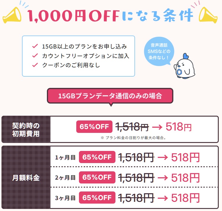 なので、月のはじめくらいから中旬ごろで契約時の容量をガメってよろしいということ。契約時に必ず発生する費用はSIM発行料550円+送料1,100円+ユニバーサルサービス料3円=税込1,653円と月途中の日割り計算のプラン料金。