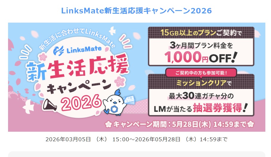 と思っていたら、記事を投稿した翌日の2026年3月5日より「LinksMate新生活応援キャンペーン2026」が発動しているじゃ~、ありませんか~!