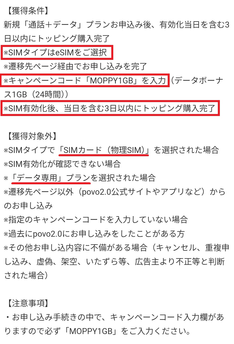 ポイントサイトの「モッピー(moppy)」の広告案件からpovo2.0の「通話+データ(音声通話)」でeSIMタイプを選び、初めてpovo2.0を契約し、SIM有効化後3日以内に有料トッピング購入が条件!今なら、約90日後に2,500ポイントがもらえるぞ~!