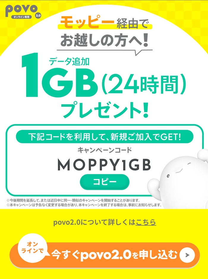 当ブログではpovo2.0が提供開始から始まった「おともだち紹介プログラム」の紹介コードを公開中しております。上記の「moppy」紹介からお申込みいただいた方限定で、紹介コードを掲載いたします!ぜひ、ご利用くださいませ~。