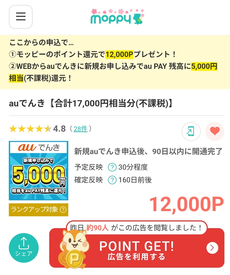 そして、新電力の「auでんき」もmoppy(モッピー)から乗り換えて初めて契約すると、povo2.0契約者でも、何と!今なら17,000Pがもらえる!「auでんき」については他社のポイントサイトを凌ぐ還元率!コレを利用すれば、上記のmoppy紹介特典2,000Pを軽々とクリアしてしまう~!オレも「auでんき」に乗り換えたがとっても便利でオトクなのだ~。