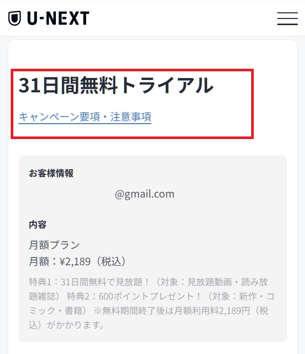 うーん、どうしよう?ああ、そうだ~。「U-NEXT」を以前から「y.u mobile」を契約してログインした状態でマイページを見たら、「31日間無料トライアル」のキャンペーンが対象になっているじゃ、ありませんか~!