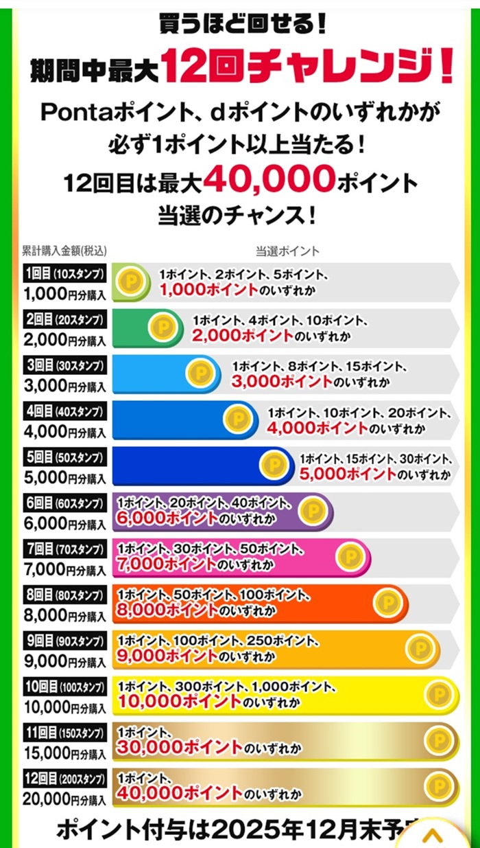 オレは2カ月連続で10回を回して約500ポイント前後をもらった~!今回は10回を超える2回分は1Pまたは高額ポイント当選となる仕様となっている。