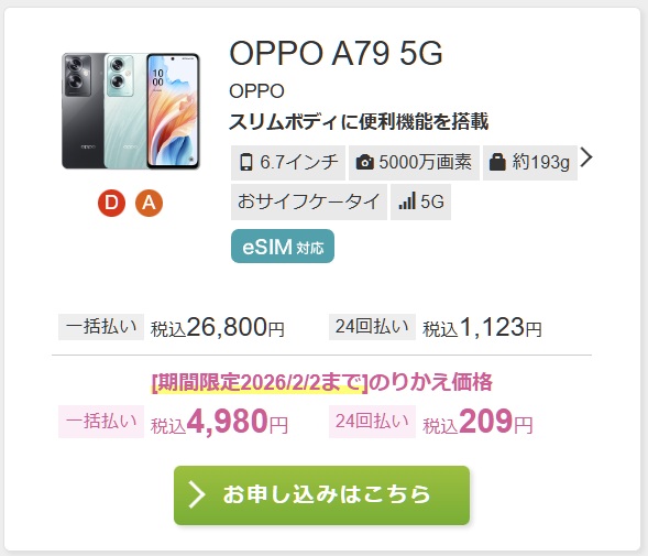 IIJmioで2025年11月21日より、他社からの乗り換えでエントリースマホ「OPPO A79 5G」が本体税込4,980円で在庫復活を果たす!キャンペーンも仕切り直しでスタートしていた~!