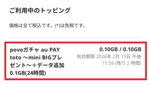 追記:もちろん2/14に自動解約180日超回避のために「mini BIG」がもらえる「povoガチャ」を購入したら・・・何と!