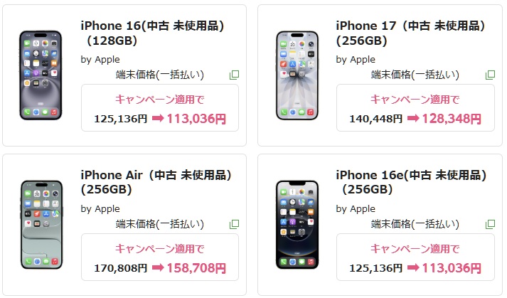 アンドロイド新品はオトクな機種が姿を消し、ハイスペックかエントリーモデル機種などしかなくなっている。アンドロイドの在庫が僅少のため、未使用品・中古のiPhoneも追加された模様・・・。