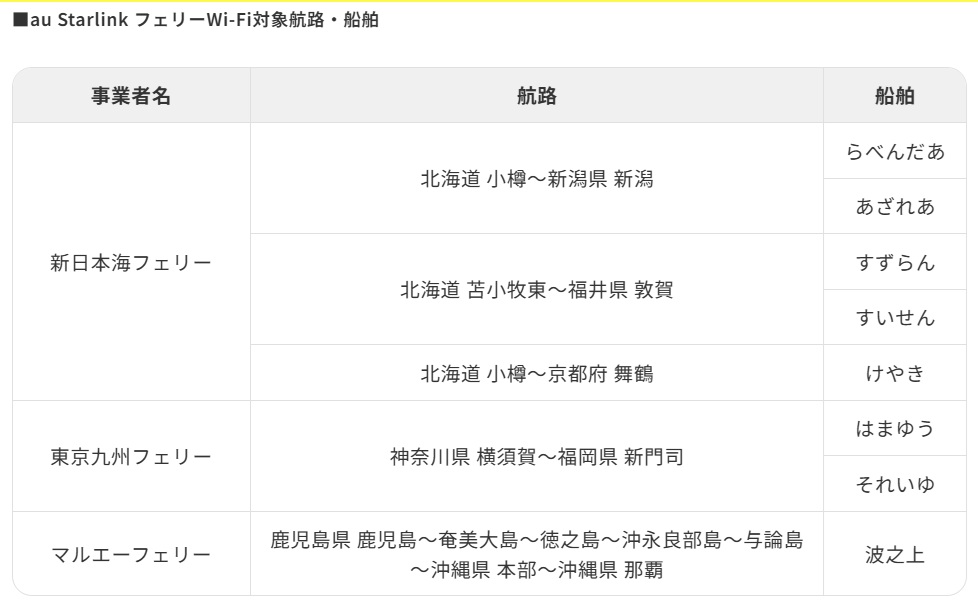 「au Starlink」の衛星通信によりKDDIは現在、全国の日本の海域までカバーしている。フェリーWifiはこれを利用したWifi通信なんだろう。