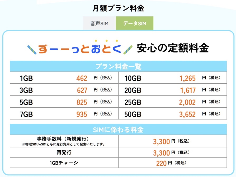 ちなみに、データSIMの提供もしているんだが、月額料金が音声SIMプランよりも月5GB以上のプランが割高になっている!