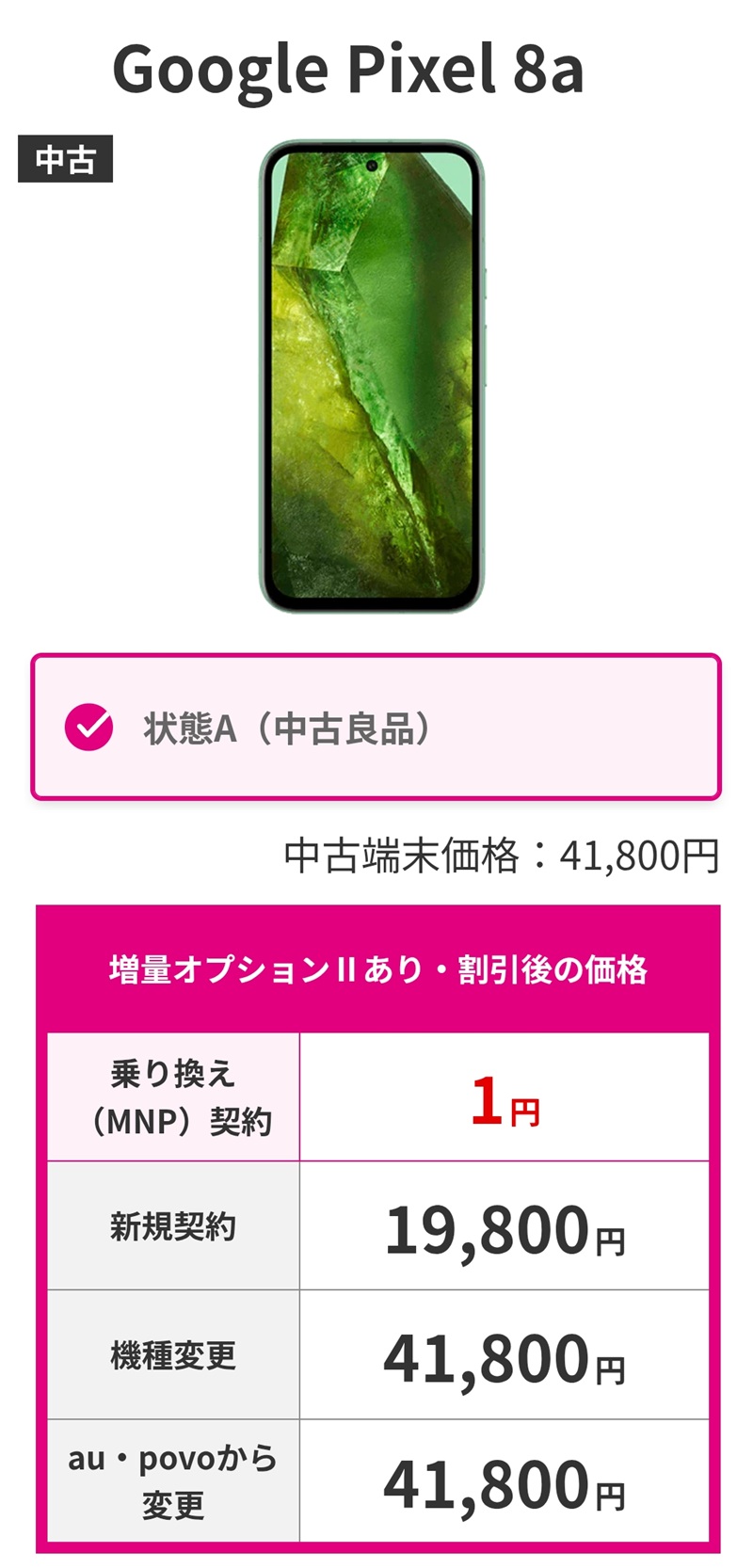 そして、何と!2026年3月19日に「Google Pixel 8a」中古ランクA状態がMNPで本体税込1円の追加がされた!「衝撃割引セール」の期間限定!締め切りは2026年3月24日まで!2026年3月22日現在、「Pixel 8a」1円はやっぱし、早々に完売した!