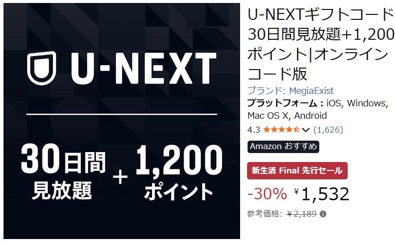 またまた始まりました~!Amazonの「新生活セール Final」の先行セールで「U-NEXT」ギフトコード版が30日間見放題+1,200ポイント付きが前回の最安と同じく、30%OFFの税込1,532円!