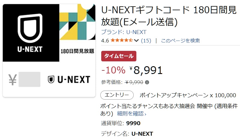 そして、「U-NEXT」ギフトコードの見放題90日間や180日間がある。そして、今回の「Amazon 新生活セール Final」先行セールの目玉は、何と!「U-NEXTギフトコード180日間見放題」が10%OFFの最安8,991円で登場!