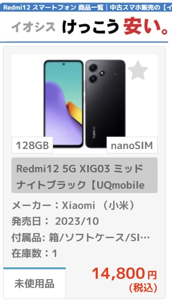 流石!Xiaomi!相当「Redmi 12 5G」は市場に出回っている模様で、中古スマホ販売「イオシス」でも、中古端末が入荷するとすぐに完売になってしまうのだ~。