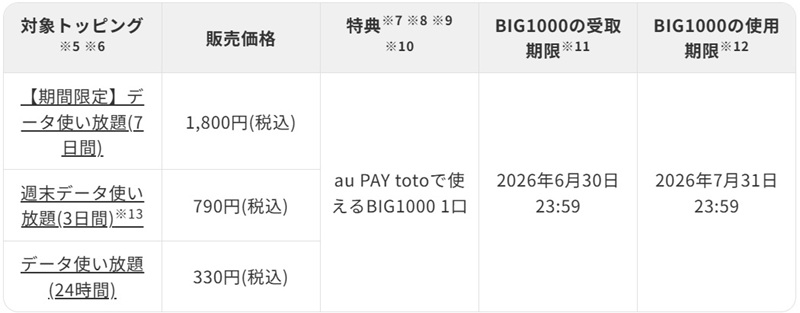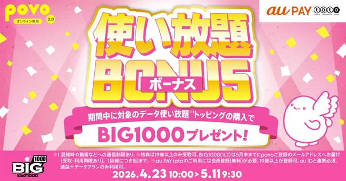 povo2.0×au PAY toto GW限定!対象の使い放題トッピング購入でBIG1000プレゼントキャンペーン!