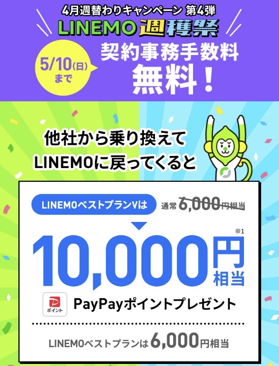 LINEMO 週穫祭4月週替わり第4弾!契約事務手数料無料キャンペーン!2026年4月27日~5月10日まで